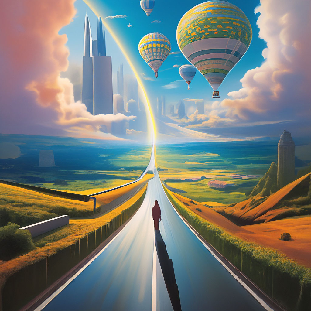 высоко , шары летят, небоскребы , путник идет ,даль