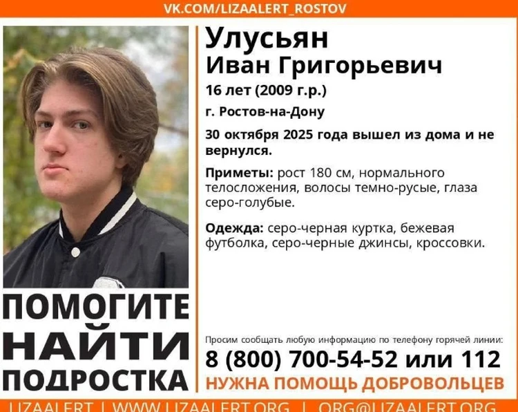 В Ростове-на-Дону полиция и волонтеры седьмой день ищут старшеклассника Ивана Улусьяна, который исчез 30 октября. В тот четверг парень поздравил свою маму Анну с днем рождения, а ближе к вечеру, предупредив родных, ушел гулять. Домой он так и не вернулся.