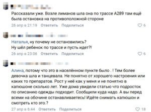 ЦитироватьЭтот комментарий породил волну осуждения со стороны других участников паблика. Одна из подписчиц прямо спросила, почему никто не остановился, ведь ребёнок шёл по трассе. «Ну шёл ребёнок по трассе — и пусть идёт?!» — возмутилась она. Свидетельница ответила резонным вопросом: останавливается ли каждый перед каждым прохожим в капюшоне, чтобы снимать с него капюшон и проверять возраст и личность? Она подчеркнула, что действовала в рамках населённого пункта, и сразу же передала информацию, как только поняла возможную связь с пропавшей.