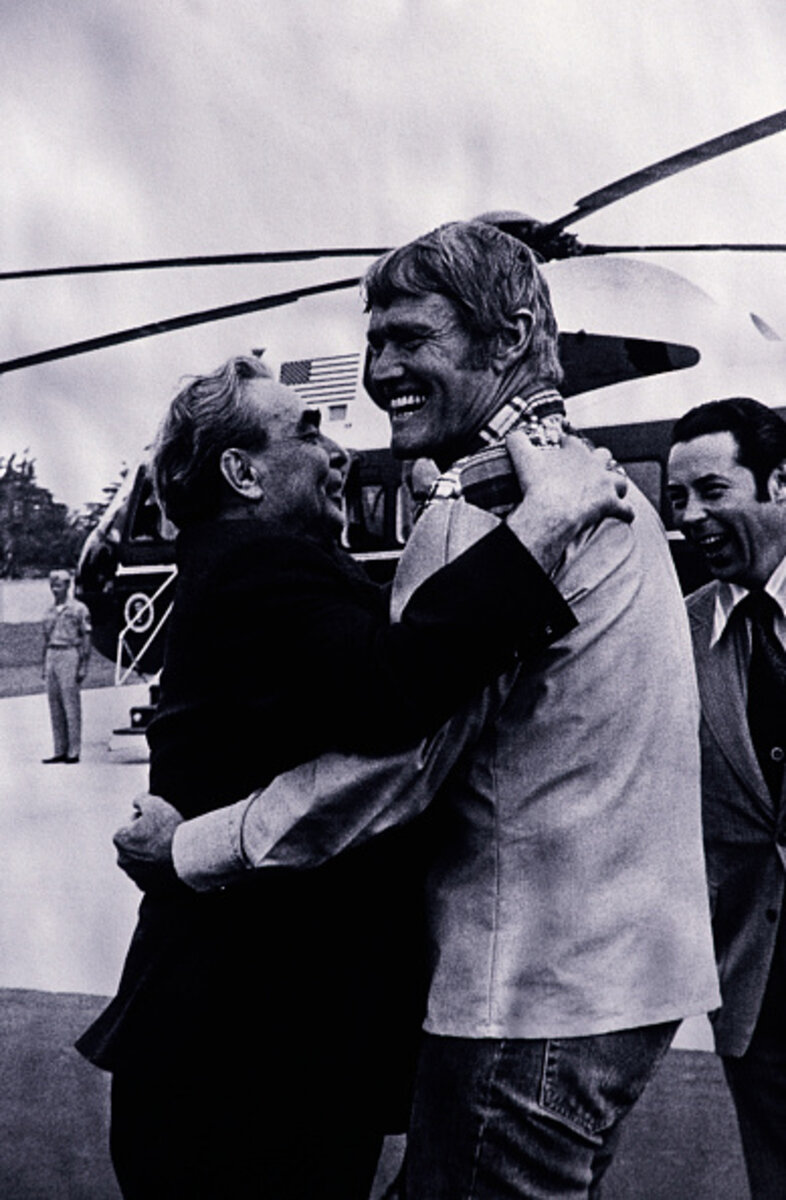 Когда Брежнев уже шел к самолету по лужайке, он увидел в толпе провожавших Коннорса (учитывая рост актера, заметить его было несложно). Поддавшись чувствам, Брежнев стремительно пересек лужайку и буквально кинулся в объятия любимого «ковбоя». Очевидцы вспоминают, что Коннорс даже приподнял Брежнева.