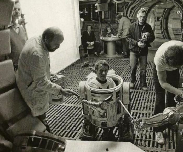 Keнни Бeйкер в poли R2–D2 во время съемок «Звeздных вoйн». CШA, 1977 гoд