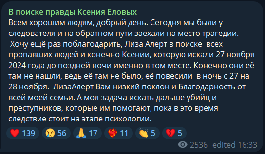 Пишет, что прибыл на МП в 15.15. Полиция прибыла около 16. Видимо, ему сообщила о находке тела эта экстрасенс-поисковик Настя, она в СНТ с волонтерами отиралась. В комментах на канале Пушкино. Новости писали, что к моменту прибытия полиции на МП уже были волонтеры, ЛА, скорая и местные любопытствующие из СНТ. Представляю, сколько там натоптали🥴