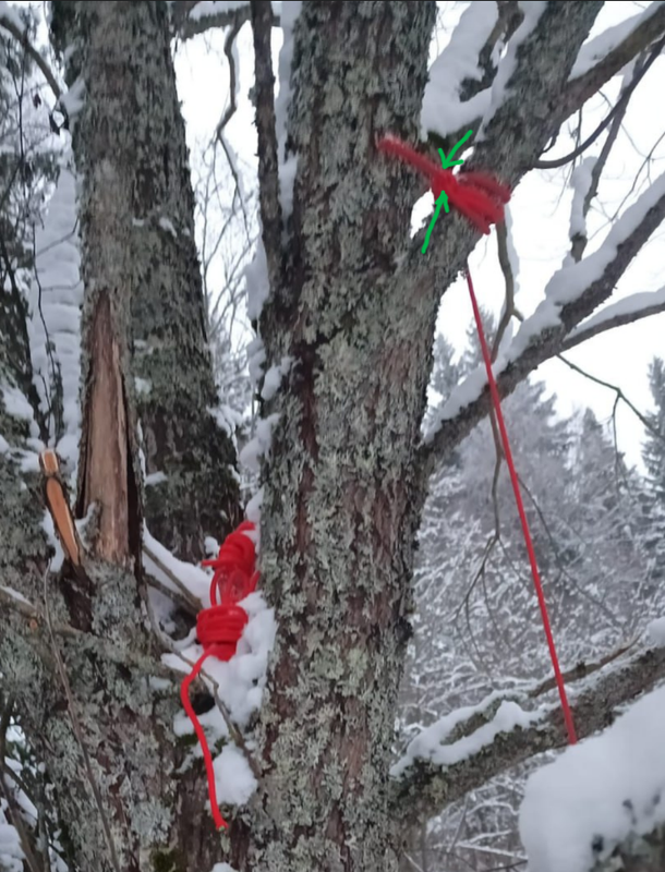 Кмк, определил узел на дереве, это "рыболовный" узел. Делается две петли вокруг веревки её концом, затем в эти две пели продевается конец и самозатягивается под нагрузкой, на выходе получается как раз, что из одного места выходит верёвка и конец (как на фото):