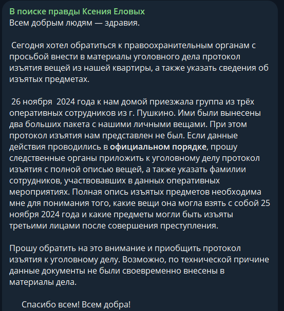 26 ноября 24 года в полиции г. Ивантеевка нас предупредили, что приедет опергруппа из г. Пушкино и возьмёт на ДНК расчёску и зубную щётку.. Капитан общался с нами, а двое сотрудников делали обыск в Ксюшиной комнате. Сотрудники вышли из комнаты с полными двумя пакетами , на мою просьбу сделать опись её вещей и занести в протокол, просто выбежали из квартиры. Некоторые вещи, которые они вынесли, я знаю, так как в ночь с 25 на 26 ноября мы сами разбирали её комнату в поисках улик и знаем, что было  (пост на канале отца от 6 октября)