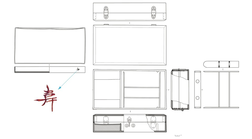 Лакированная шкатулка представляла собой прямоугольный деревянный ящик, раскрывающийся как книга, размером 31,8 × 17,4 × 7,8 сантиметра. Внутри шкатулки лежали две кисти, щетинки которых изготовлены волос каких-то животных, а их ручки — из бамбуковых палочек длиной 17,6–17,8 сантиметра. Кроме того, в ящике хранились сложенные листы бамбуковой бумаги, а также брусок туши, размер которого составляет 10,8 × 2 × 0,6 сантиметра, а масса — 18,3 грамма. На лицевой стороне этого бруска, изготовленного из сосновой сажи, видны вертикально расположенные иероглифы — хвалебные слова о качестве туши. Подобные надписи, наряду с именем мастера или местом производства, было принято оставлять на подобных брусках во времена династии Тан.
