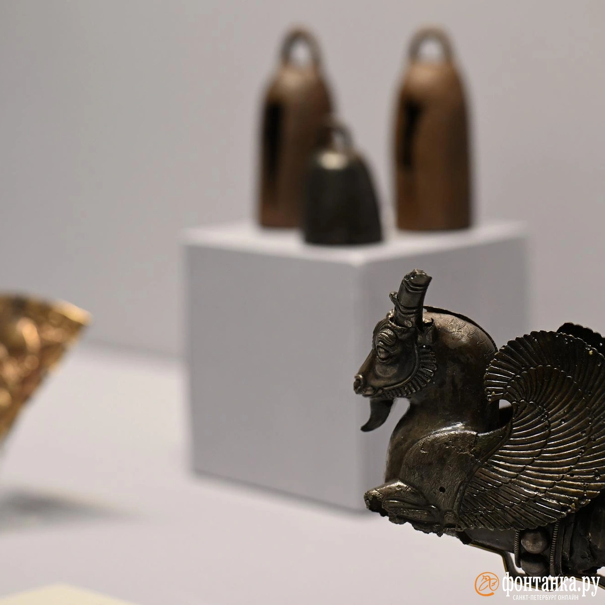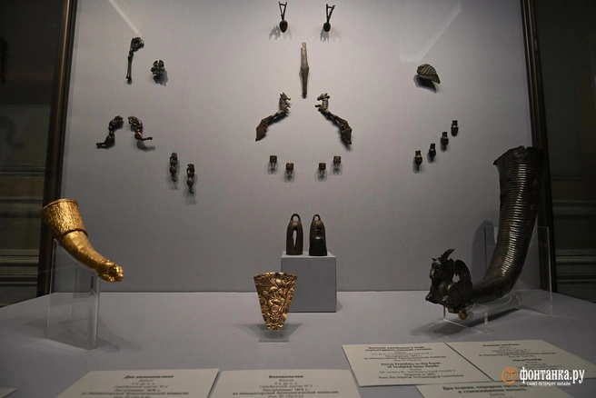 «Первая часть — это находки, которые были сделаны в ходе исследования Семибратних курганов, — в двух витринах представлена лишь небольшая их часть, многое — на постоянной экспозиции Эрмитажа: часть находок вы можете найти в Зале Боспора, часть представлена на экспозиции Золотой кладовой, — рассказывает Дмитрий Чистов. — Поскольку это довольно объемная коллекция, было бы сложно в рамках такой маленькой выставки ее представить, Поэтому мы здесь собрали наиболее знаковые вещи. Также были специально отреставрированы некоторые бронзы — например, узда в скифском зверином стиле, которая выставлена на этой витрине, ранее не выставлялась».