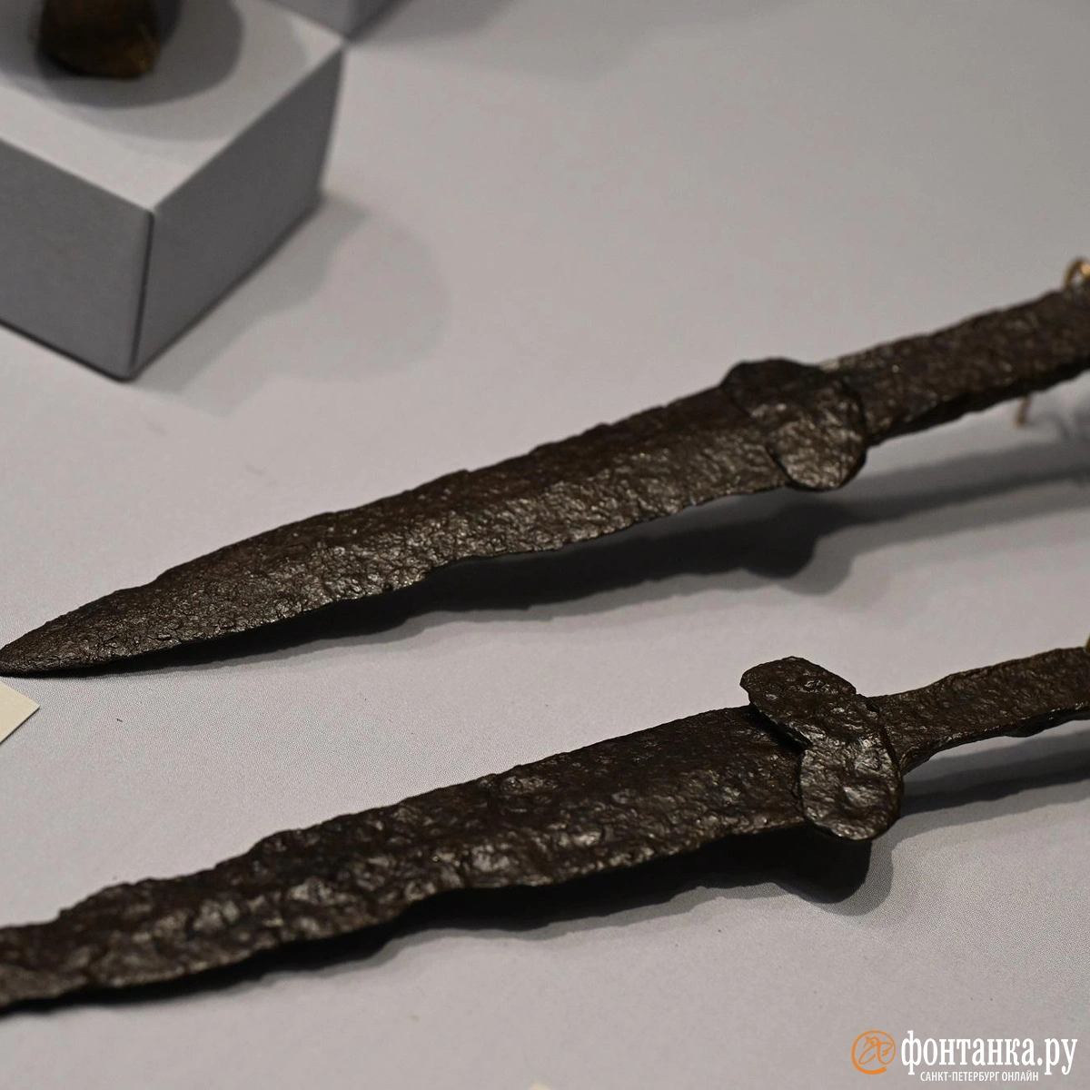 Кроме самого поселка, археологи исследовали некрополь неподалеку — и в витринах есть находки оттуда: кинжалы-акинаки (с антенными или волютными навершиями), наконечник копья, примеры лепной керамики