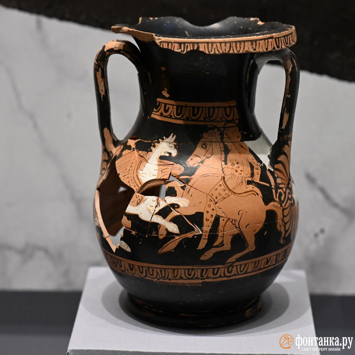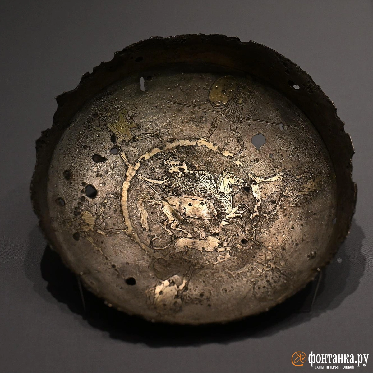 «Погребальный инвентарь, который найден в этих курганах, — мультикультурный, — продолжает Дмитрий Чистов. — Он включает греческие вещи: здесь вы можете увидеть, например, аттическую краснофигурную керамику и серебряный килик с изображением героя Беллерофонта, который побеждает химеру (к сожалению, фрагментарно сохранившийся, но это прекрасная работа). Но, с другой стороны, как вы видите, узда, сам погребальный обряд, который включал в себя погребение коней (иногда их было до 13 штук в каждом захоронении), — скифский, признак номадов, кочевников. При этом в тех же курганах найден знаменитый серебряный ритон: он не скифский и не греческий, а персидский, то есть он был произведен в иранской державе Ахеменидов, Персидской империи. Все это показывает культурные и торговые связи Синдского царства — ну и в целом, что эта правящая династия была, с одной стороны, сильно эллинизирована, а с другой стороны — возможно, они были выходцами из кочевнического мира».