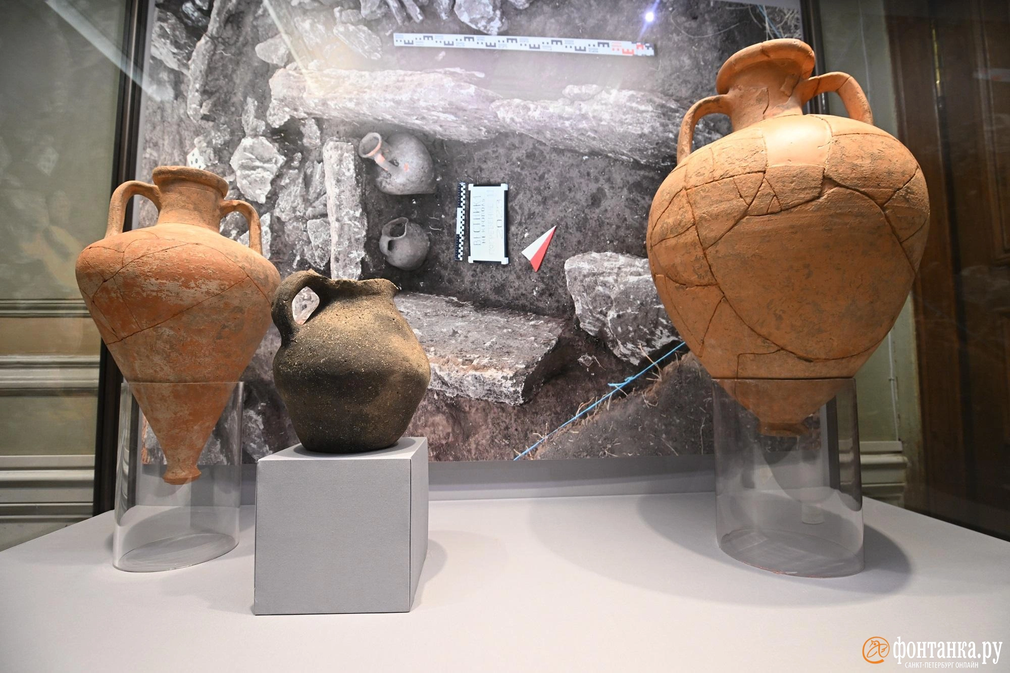 «Здесь представлены находки, которые были сделаны в слоях вокруг этого святилища — это греческие амфоры, — показывает куратор. — Амфоры с острова Хиос, из Гераклеи Понтийской — с южного берега Чёрного моря, также была найдена пелика (сосуд. — Прим. ред.) керченского стиля, краснофигурная аттическая, изображающая схватку амазонки и грифона».