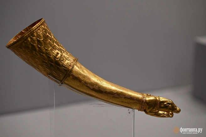Узда V века до нашей эры с изображениями протомов — передних частей коней — занимает почти всю витрину. Рядом с ней — два ритона, воронкообразных сосуда для питья в виде опущенной вниз головы животного.