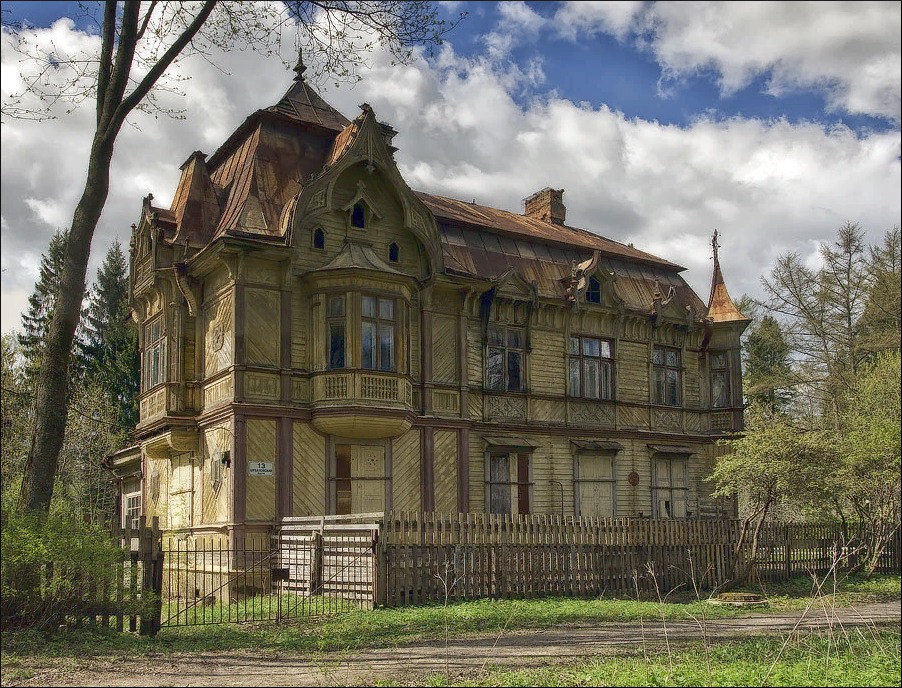 И первым нас встречает сказочный терем юриста Георга Месмахера на участке, приобретенном им в 1880-х у следующих владельцев поместья Воронцовых-Дашковых(это потомки графов Шуваловых, Воронцовых и княгини Екатерины Дашковой, подруги Екатерины II, президента российской Академии наук). Эту дачу ему построил брат, архитектор Максимилиан Месмахер, в модном тогда неорусском стиле. Месмахер во второй половине 19 в. построил в Петербурге много выдающихся зданий, самые заметные из которых: новые корпуса Аничкова дворца, дворцы великих князей на Мойке 122(сейчас там концертный зал Мариинки) и Адмиралтейской набережной, здание художественного училища барона Штиглица (знаменитая Муха). Сейчас это здание находится в не лудшем состоянии, фактически бесхозное, нуждается в реставрации, и тем не менее визуально очень впечатляет. Говорят, что последнюю пару лет дачей владеет некая блогерша Рада Русских, "спонтанно" купившая эту дачу на аукционе. Результат этой спонтанности налицо, впрочем, хорош был и прежний владелец, институт токов высокой частоты, следы от хозяйствования которого там повсюду. Институт этот владеет до сих пор и остальной усадьбой, в том числе малым дворцом Воронцовой-Дашковой 1882 г. постройки, Большим Дворцом 1907г. постройки, не считая многочисленных хозяйственных построек. Туда не пускают, но есть подозрения, что и там сейчас не намного лудше.